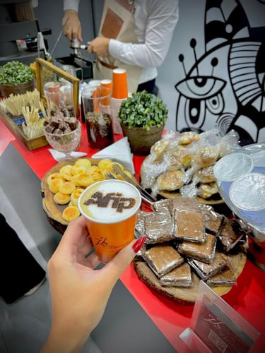Montamos uma verdadeira cafeteria no seu evento, promovendo interação, conectividade, bons negócios, além de cafés e estrutura personalizada com o logotipo da sua empresa.